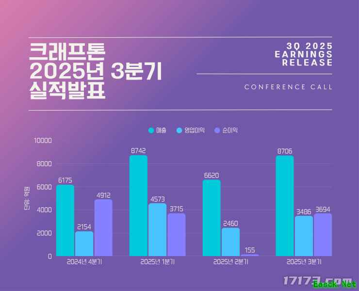 - 当期净利润 3,694亿韩元(折合人民币约为18亿元,同比增长204.4%,环比增长2,278.2%)