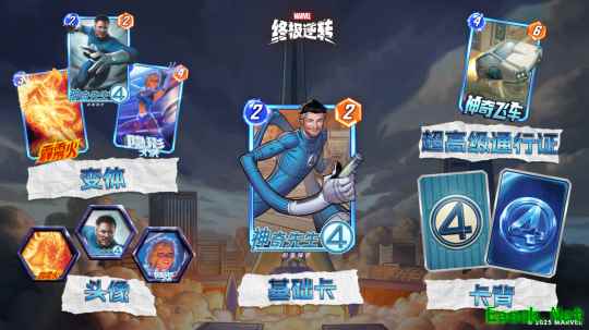 购买【神奇四侠】赛季通行证,就可以获得全新的角色「神奇先生·初露锋芒」。随着通行证等级的提升,还可以解锁全新变体、头像、卡背和其他资源。