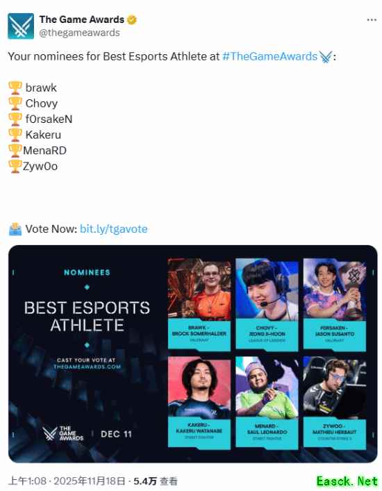 今日,TGA官方公布了年度电竞选手提名,引发争议。