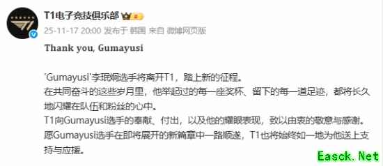 愿Gumayusi选手在即将展开的新篇章中一路顺遂,T1也将始终如一地为他送上支持与应援。