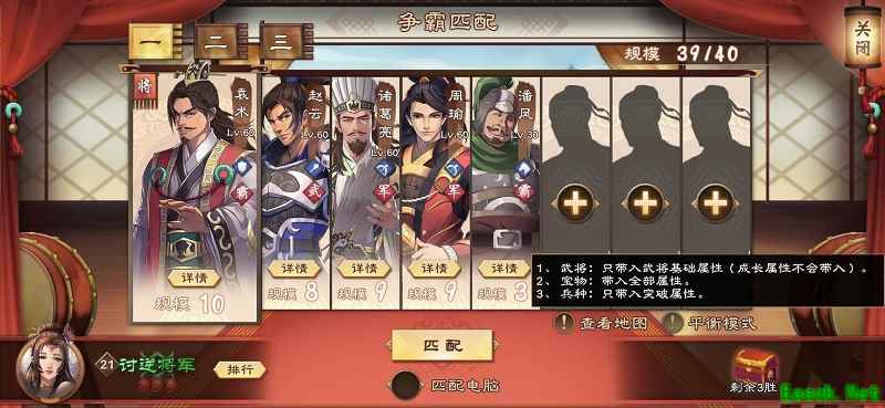 不过制作团队也很贴心的将主线分为了“三国编年史”和“讨伐模式”两种玩法。前者相对简单,玩家可以体验从黄巾之乱伊始,至火烧赤壁之时的三国故事;而后者则需要玩家有一定战棋基础,在有限的资源限制下,挑战子龙救幼主、曹操下邳诛吕布等经典剧情的高难度副本。除此之外游戏中还有诸如平乱、决斗、战役等PVE玩法,可以满足不同玩家的口味。