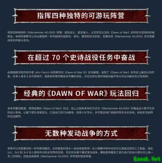 Black Library作家John French参与了游戏超过70个任务的战役剧本创作,战役将支持单人和合作两种游戏模式。