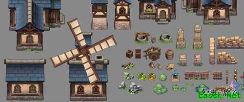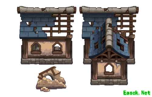同时,为了符合下层的设定,大部分的建筑都是比较破旧的,而在加了风车元素后,整个村镇的风格,会更偏向乡村一点,建筑以砖块+木板为主,也会辅助的去加入水井、马车等去烘托这个氛围。