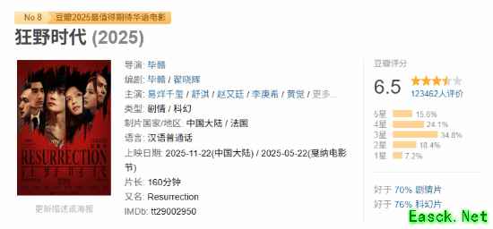 值得一提的是,由毕赣指导,易烊千玺主演的《狂野时代》目前豆瓣评分为6.5分。有观众表示,本片是“导演的一场自嗨吧,没考虑过受众”“故弄玄虚”;也有给出好评的观众表示本片是一部非常有艺术感的电影,画面很美。