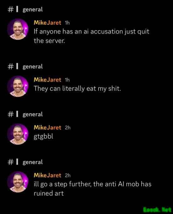 在 Discord 上,Jaret 就此事多次重申立场,并附上了一张来自 Bluesky 的截图,其中有 12 条回复。在这些帖子中,Jaret 声称所使用的美术作品并非 AI 生成,并且明显是在发脾气,还说了以下这些话: