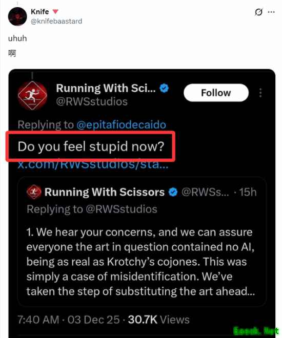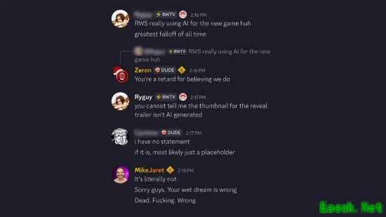 此外在X平台上RWS官号曾攻击一名质疑新游使用AI的用户是“蠢货”。