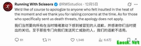他们也为 Jaret 和其他工作人员在 Discord 上发布的消息道歉,但特别提到 ,那些发出死亡威胁的人不在此列。