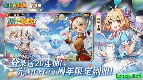 时光荏苒,《四叶草剧场》在团长们的期待中迎来了第一个周年庆典,周年限定福利活动也全面启动!登录即送20连抽,还有限定剧照免费领取、人气皮肤返场等超多惊喜等你来!商店内首充双倍重置,周年庆典皮肤、限时折扣礼包也将同步上架,14号当天还有惊喜邮件不要错过!