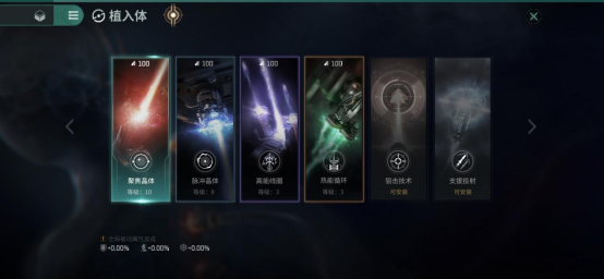 统合部通过分析被飞行员摧毁的冬眠者巢穴,成功研发出了12种植入体,它们会大幅改变舰船已有的武器系统,为旧的武器增加全新的战斗策略。它们可以改变武器输出的节奏,改变武器的伤害类型,甚至赋予舰船前所未有的特殊能力。