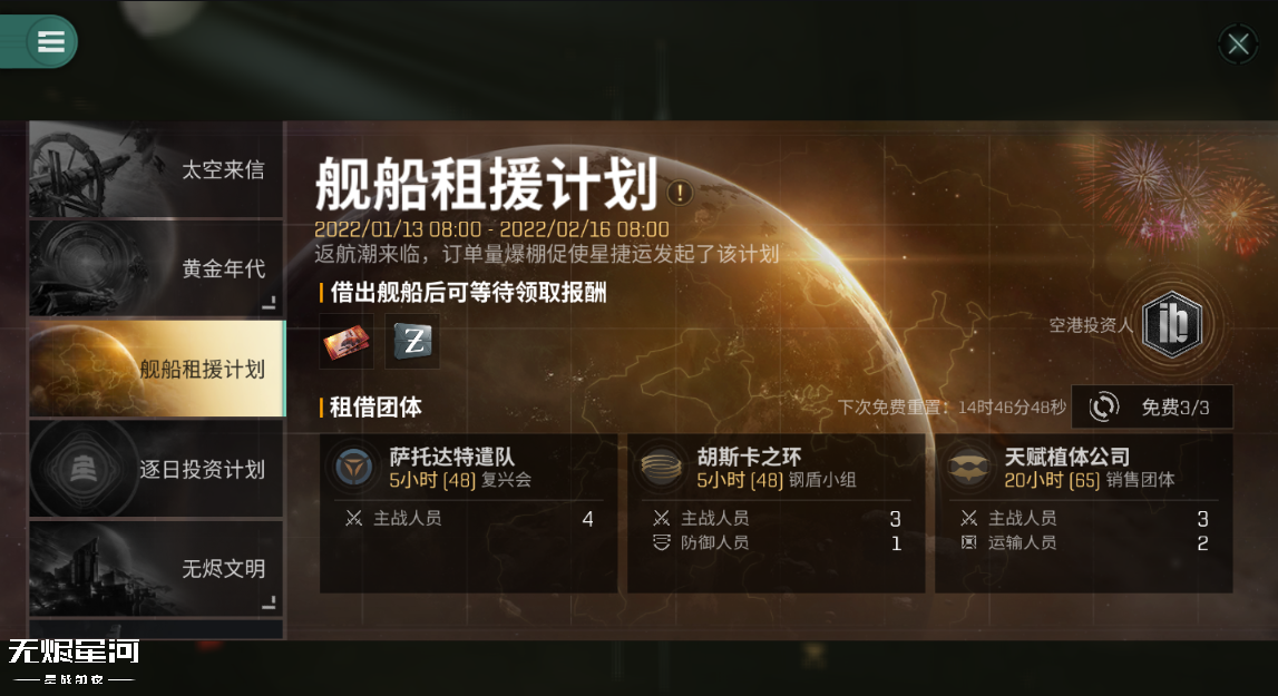 临近宇宙中一年一度的“返航节”,星际春运也正式拉开了帷幕,疯涨的客单量让星捷运忙得焦头烂额。为帮助他们缓解压力,飞行员们只需根据客户的定制需求,巧妙搭配租赁舰船组合,租借你的闲置舰船,轻松赚取丰厚租赁报酬吧!
