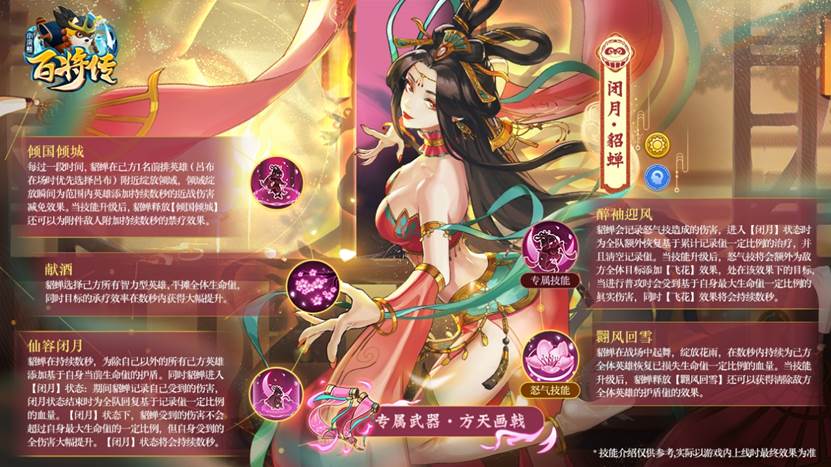在貂蝉技能设计时,我们考虑她作为一位绝世美女应该展现的美颜身姿;因此当貂蝉释放怒气技能【翾风回雪】时,貂蝉会在战场中惊鸿起舞,并绽放花雨为己方全体英雄恢复血量,同时当该技能等级达到一定层级,【翾风回雪】技能还将具备清除敌方全体英雄护盾值的特殊能力。