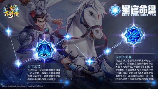 郭盛点亮完整命盘后,当己方场上存活的英雄数量不超过一定人数时,郭盛自身受到的物理和法术伤害都将大幅减少;郭盛的【寒冰刺】命中目标时,可以对目标施加【冻结】效果(不会被护盾效果免疫)并在冻结结束后的一段时间内,降低目标加速等级和疗伤效果。