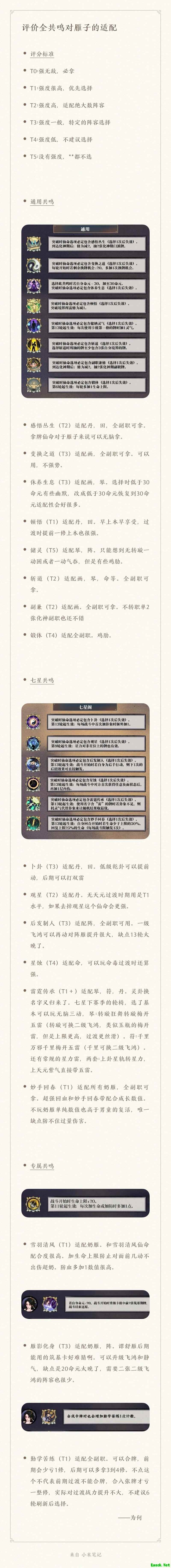 雁影化身(T3)适合搭配奶系雁阵。谭舒雁后期可用的筑基卡较少,可通过升级飞鸿与静气结合副职弥补。但20点命元获取过晚,且需两张二级飞鸿,实际适用阵容较为有限。