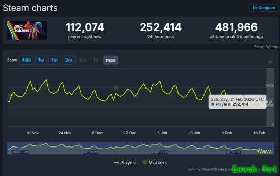 有外媒指出,尽管《Arc Raiders》的用户活跃度和黏性相较于同期发售的《战地6》和《使命召唤22》来说占尽优势,但其热度也在缓慢下降:据SteamDB数据,目前本作的在线人数已经从2025年11月16日最高点的48万人跌到目前最高25万人左右: