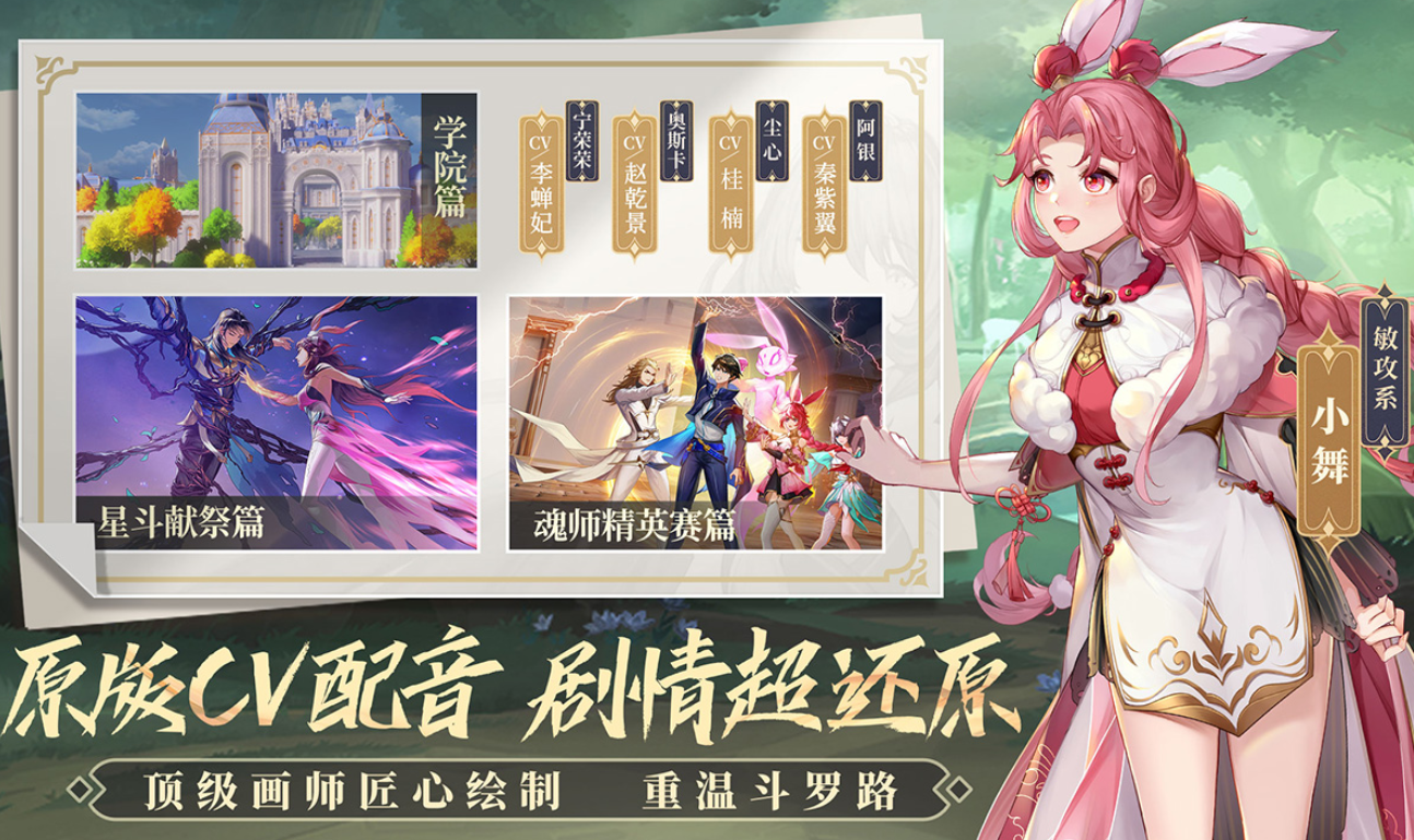 除了剧情外,游戏在技能方面也极力还原,不仅有大力金刚熊、七宝转出有琉璃等熟悉技能,并且还精心设计了它们的特效,给你顶级的战斗视觉体验。此外游戏的立绘也非常精美,像看动画一样的玩游戏,仿佛梦回当年一起追斗罗大陆的岁月,当然现在已经2021年了,官方在立绘的设计上还加入了很多小细节,各位不妨进游戏后慢慢探索。