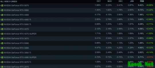 数据显示,RTX 5070的市场份额从1月的2.87%飙升至2月的9.42%,单月增长率高达228%,创下Steam硬件调查有史以来最剧烈的份额变动。值得注意的是,这一增长并非源于RTX 4060的下滑,而是RTX 5070自身的爆发式普及。