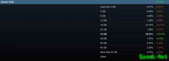 另一个显著变化来自系统内存配置。数据显示,32GB内存以56.93%的占比首次成为Steam玩家最主流的内存容量,环比增长18.91%。与此同时,长期占据主导的16GB内存份额则从近40%下滑至27.47%。