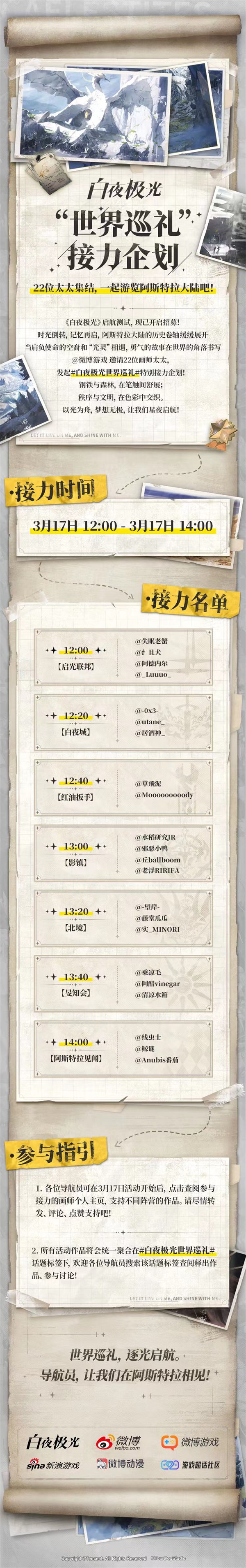 此外,《白夜极光》还联合微博游戏、新浪游戏开启了#白夜极光世界巡礼#活动,特邀失眠老蟹、纟且犬、阿德内尔等22位知名画师,于3月17日接力发布贺图,活动将由当日12:00整持续至14:00整,于同日17:00微博大V账号将会整合本次的巡礼作品,所有玩家均可前往为喜爱的画师太太支持打call!
