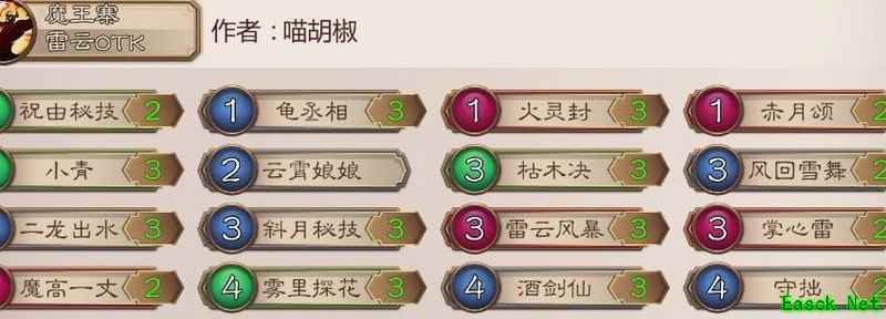 单核策略,快速提升修为,中期靠过牌与掌法抢血,后期以火灵封雷云配合赤月颂终结对手。