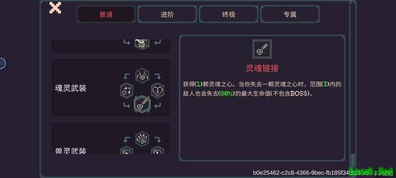 在击败第一个Boss后,就可以开始着手收集一套新的装备组合——黑心套。其中最关键的是要解锁最终天赋灵魂链接。因为从游戏中期开始,Boss普遍会带有一定的增益效果,特别是遇到具有冰冻免疫属性的Boss时,战斗会变得非常棘手。偶然间我发现,在无尽模式中灵魂链接对Boss同样生效(可能是系统漏洞),所以点出这个技能后,打Boss变得轻松许多——可以直接冲上去硬刚,毫无压力。