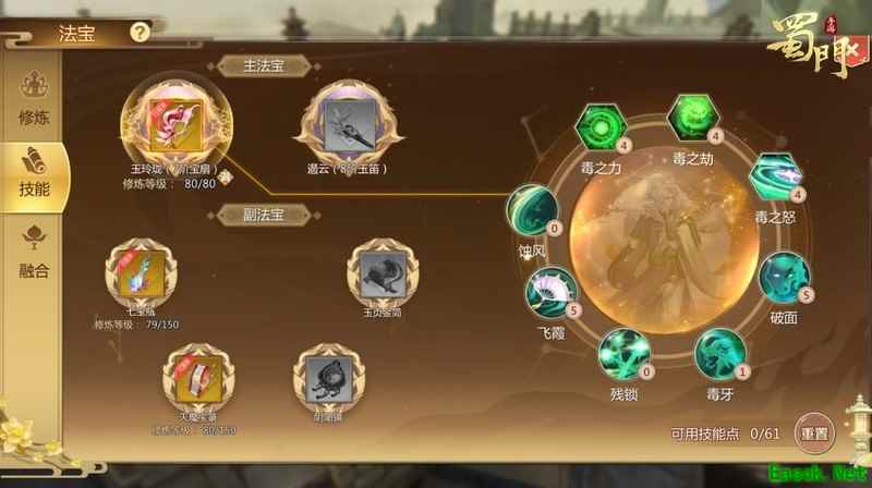 宝扇优先点满破面,其次是飞霞减防,再点毒之力、毒之劫、毒之怒,增强毒系伤害。
