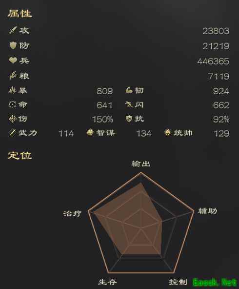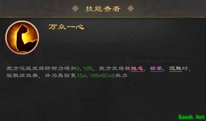 我方近战武将防御提升9.16%,受到魅惑、眩晕、沉默效果时将自动驱散,并回复154.16%加上8048点兵力,技能效果随等级增强。