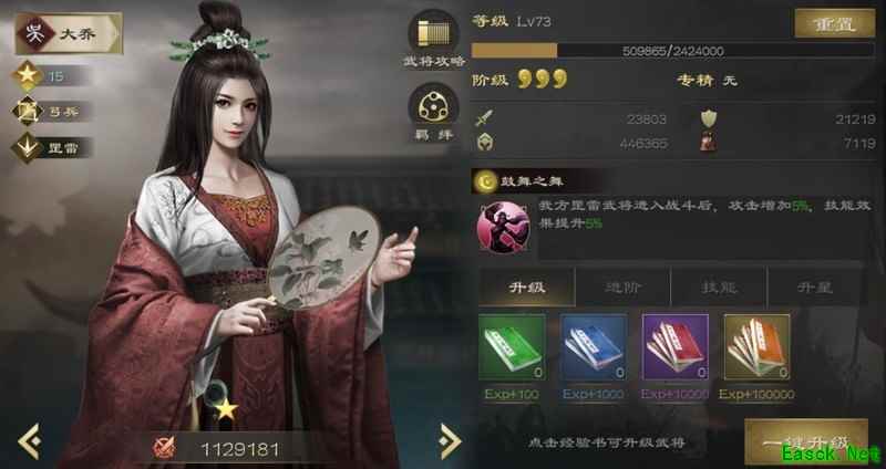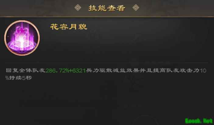 大乔为全体队友回复286.72%的兵力,并驱散减益效果,同时提升队友攻击力10%,效果持续5秒,技能效果随等级提升。