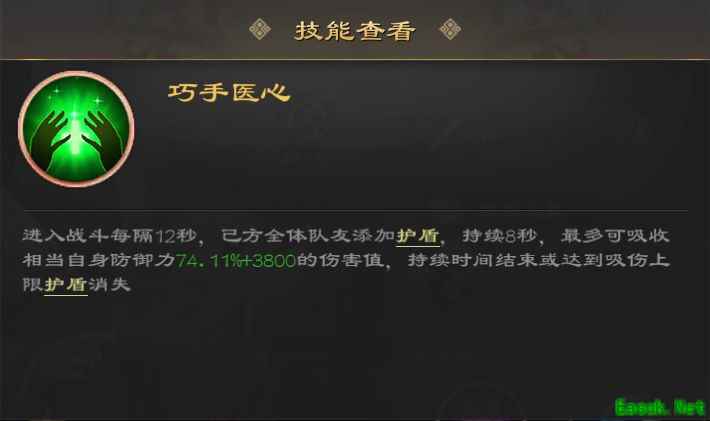 进入战斗后,每12秒为全体己方队友生成一个护盾,持续8秒,最多可吸收相当于自身防御力74.11%加上3800的伤害,护盾在时间结束或吸收上限达成后消失,技能效果随角色等级提升而增强。