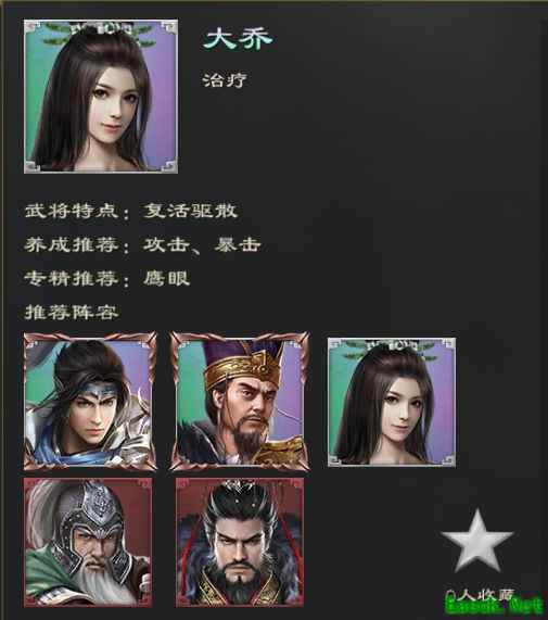 大乔的三项基础属性较为平均,相比其他功能性武将表现更为出色。虽然她的技能伤害并不突出,但以辅助为主,整体效果类似于加强版的貂蝉。这使得她在面对物理、战法或计策类攻击时,都有不错的应对能力,从而增强了队伍的适应性与稳定性。作为辅助型武将,大乔能够显著提升队伍的免伤能力,因此无论是在新赛季的PVE推图还是PVP对战中,她都是一个非常理想的选择。
