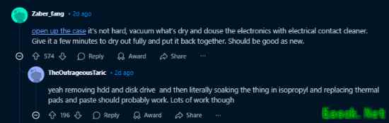 “把硬盘和光驱拆掉,然后用异丙醇浸泡电子部件,再重新更换散热垫和导热膏。工作量大,但可行。”