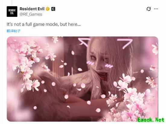 在回复神谷英树的推文时,官方账号发布了一张图片:一只正在啃咬格蕾丝的“歌唱丧尸”,被P上了猫耳、害羞脸红和飘落的樱花花瓣,整个画面瞬间变得“萌化”。