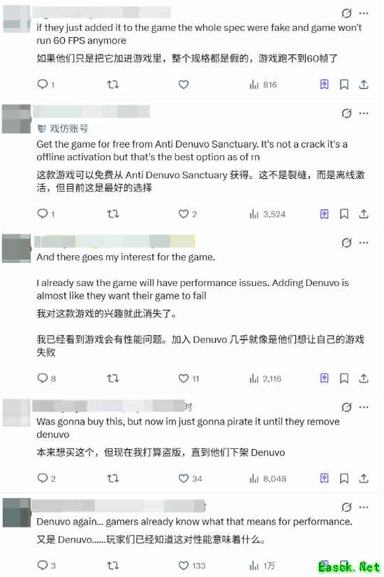 许多原本对游戏充满期待的玩家纷纷留言表示:“预购已取消。”更有激进者直言:“本来想买,现在我宁愿等破解版,直到他们移除D加密。”