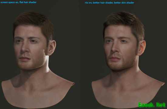 为佐证观点,他晒出一组对比图:同一个他亲手制作的角色模型,左侧是普通光栅化渲染+简陋着色器,右侧是光线追踪+更好的头发/皮肤着色器——两张图看起来几乎不像同一个人。而这恰恰是DLSS 5在做的:以更低的成本,让画面呈现出右侧甚至更好的效果,且几何体、纹理、光源都没变。