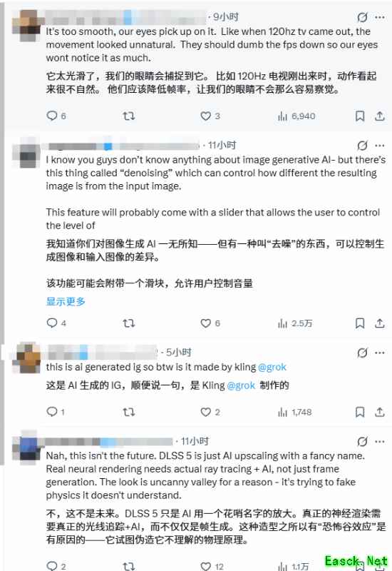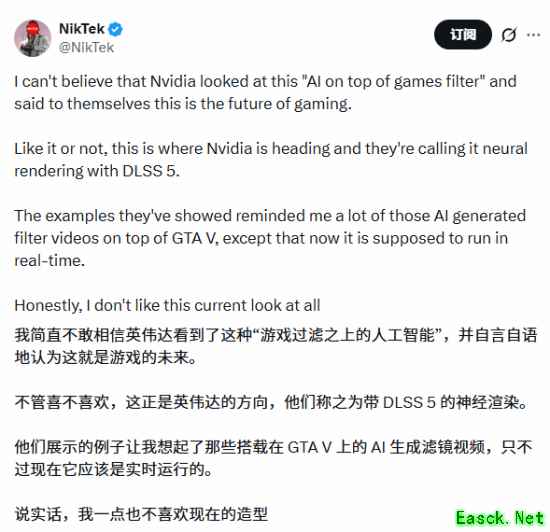 科技媒体 NikTek 率先发声吐槽,直言无法理解英伟达的决策,称其看着这款 “叠加在游戏之上的 AI 滤镜” 却笃定这是游戏的未来走向,还将演示效果类比为《三男一狗》的 AI 生成滤镜视频,并明确表示完全不接受当前的呈现效果。这条推文获得超高关注度,成为此次争议的导火索之一。
