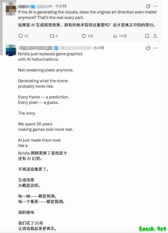 有玩家提出质疑,若 AI 全权生成视觉内容,游戏原生美术方向是否还有存在的意义,原有的艺术创作逻辑是否会被彻底颠覆;也有玩家指出,英伟达此举可能进一步推动云游戏布局,未来玩家或许无法在 PC 端直接体验 DLSS 5.0 的完整效果,反而要依赖厂商的服务器服务。