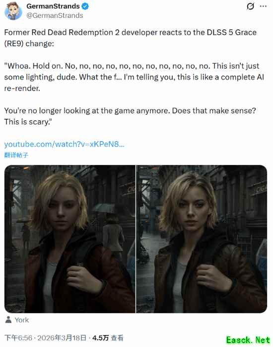 “哇,等等。不不不不不,哥们,这可不只是改改光照那么简单。”York在看到DLSS 5处理后的格蕾丝画面时评论道,“我跟你说,这xx是用AI完全重绘了一遍画面。你已经不再是在看原本的游戏了。你能明白吗?这有点吓人。”