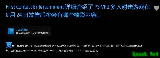 更新内容显示:“《防火墙终极版》的在线功能将于2026年9月17日终止,不再可用。”同时还提醒玩家:“由于本作必须联网才能游玩,从2026年9月17日太平洋时间上午10点起,游戏将无法继续运行。”
