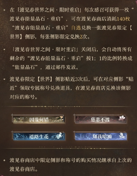 1月15日-1月22日,「渡见春」系列世界等级侧影【顾时夜 · 因缘何错】【易遇 · 慈悲不渡】【柏源 · 遥路生花】【夏萧因 · 知我暗涌】限时重启,届时玩家可使用「渡见春空间碎片」进行感召。本期「渡见春」重启后,感召次数、保底计数,将从往期「渡见春世界之间」中继承。
