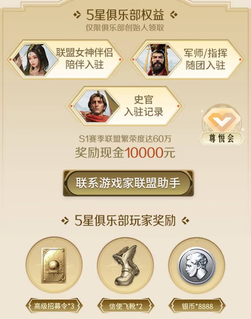 真正既玩游戏又能赚钱,更有专属定制伴侣&军师辅佐。完成活动要求在游戏不删档开启后即可领取高级招募令、金币、技能经验、心悦专属主城皮肤(心悦会员)等专属好礼,S1赛季结束联盟繁荣度达60万更可获得10000元现金奖励!马上加入《世界启元》俱乐部,提升自己俱乐部势力值,获得星级俱乐部奖励!