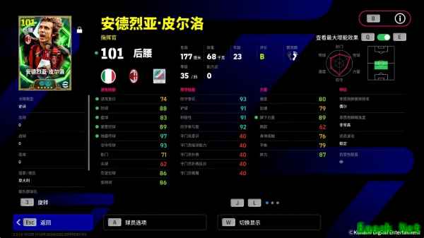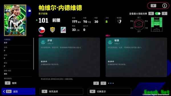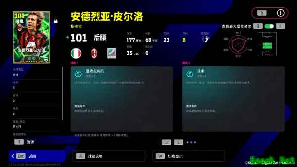 皮尔洛增能属性为【进攻发动机 +3】,传控能力的全面增强的他既能牢牢掌控球权,也能利用传球拉扯防线!