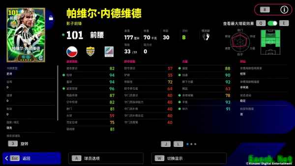 内德维德增能属性为【护球+3】,配合【无定型传球】特殊技能,他在盘带推进时展现出极强的稳定性与对抗能力。即便在被多人包夹、身体重心失衡的情况下,他依然能够强行完成高质量出球!