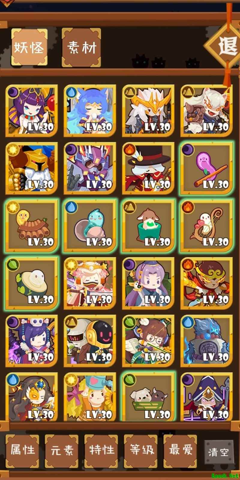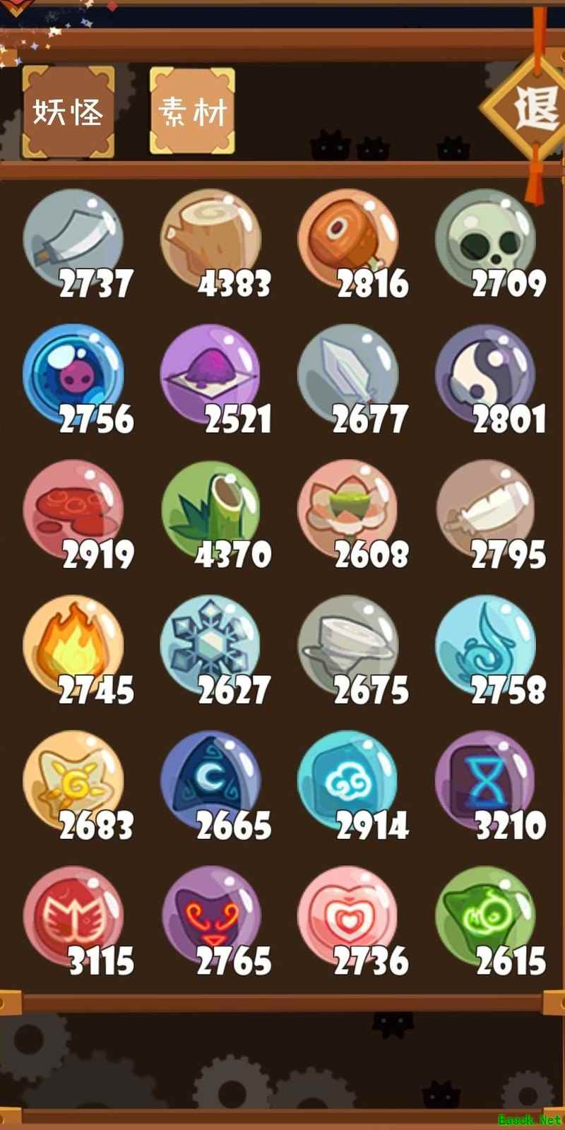 仓库设有妖怪与材料两栏,同时用于妖怪的升级培养。