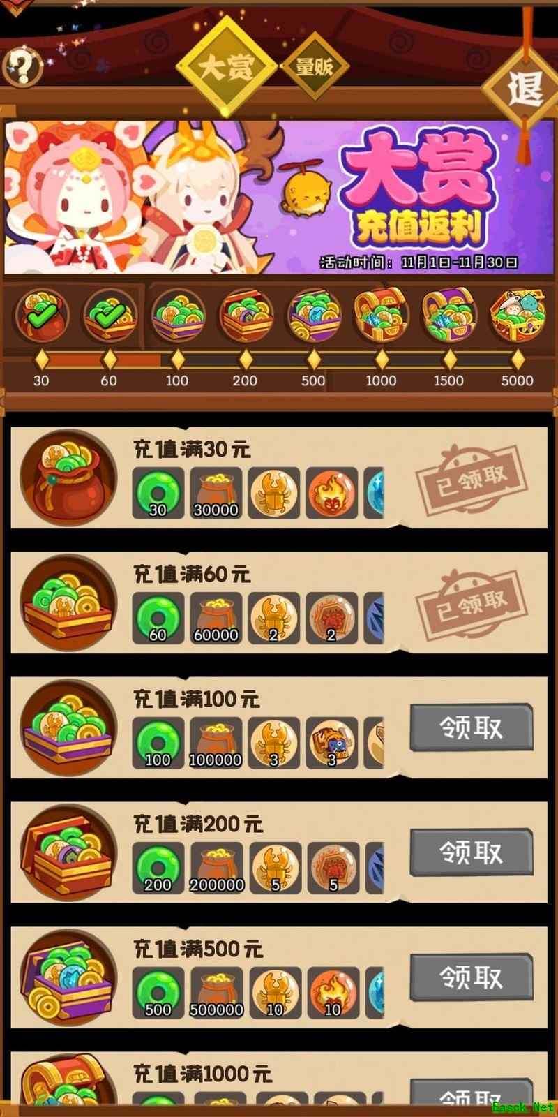 每月充值累计达到指定额度可领取对应奖励:充值1500元随机获得一只未拥有的金色怪物(万元户、柠公主除外),充值达5000元则可获得一周年限定套装。