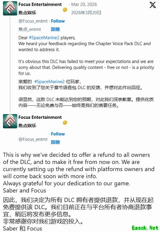 Focus Entertainment正式宣布,《战锤40K:星际战士2》里那段饱受玩家诟病的5美元语音包DLC,将会对所有玩家免费开放。官方还给出了补偿方案,之前花钱购买过这款DLC的玩家,在不久之后都可以拿到全额退款。