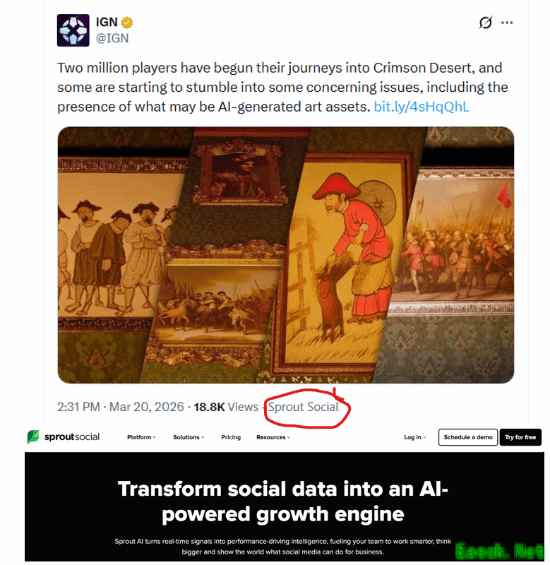 但接着有网友发现:IGN的X贴文带着一个“Sprout Social”的标签,而这是一个可以用来生成文本并润色,还能定制发布时间的大模型AI工具。