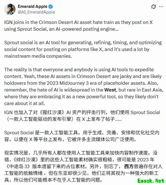 不过请读者放心,的本篇文章并非AI生成,因此不用担心会出现“报道IGN用AI报道《红色沙漠》用AI的文章是AI生成的”这种话题。