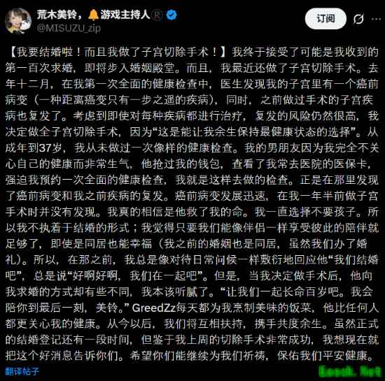 现年37岁,日本游戏界知名女主持荒木美鈴在社交媒体上发文,分享了自己的人生两大重要决定:结婚与接受子宫摘除手术。
