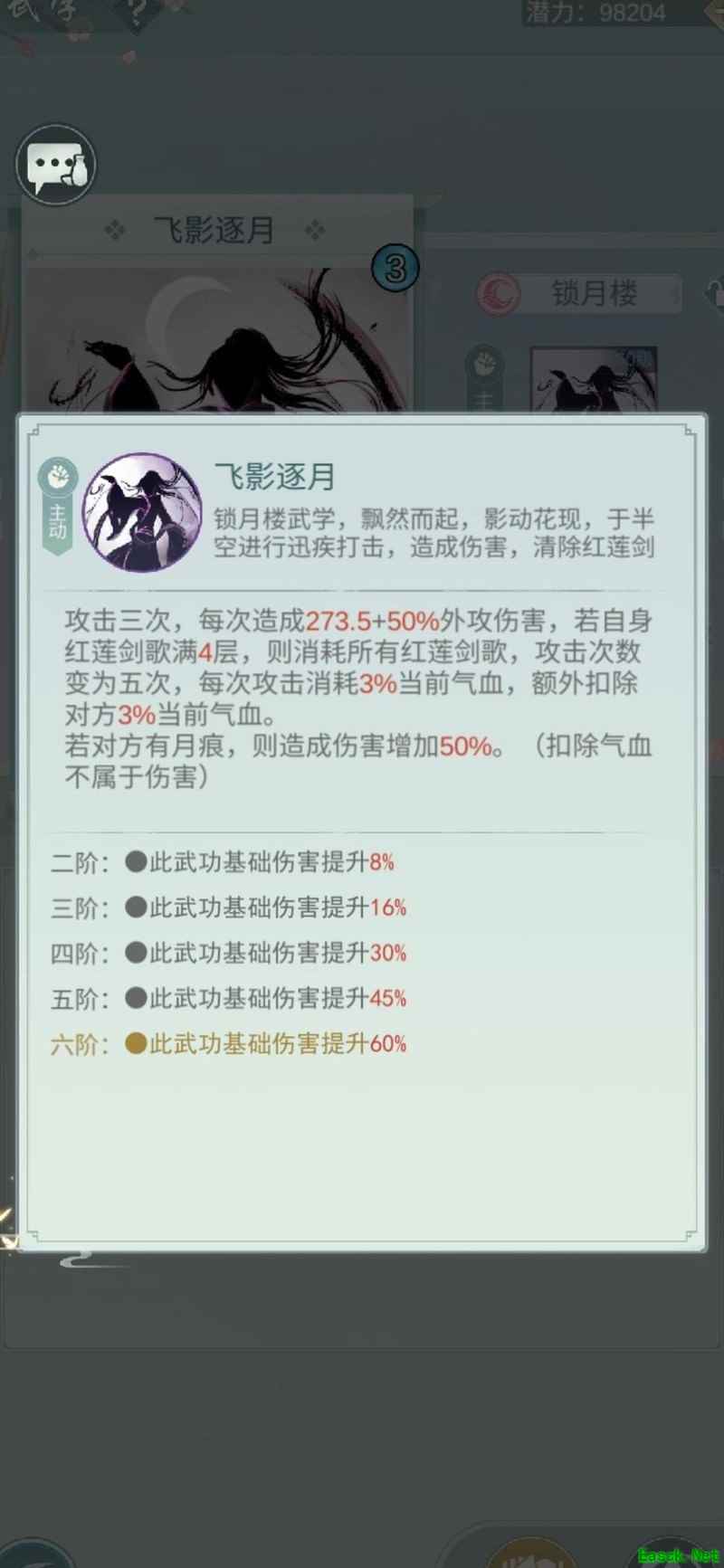 新锁月手动四拼玩法,技能一阶即可上手。开局释放长歌行,接轻云进入镜花水月状态并开始记录伤害,随后打出刻入DNA的折月剑连招,此时应已叠满四层红莲剑歌。接着使用飞影,需注意飞影的真实伤害仅在红莲剑歌达到四层后触发,可通过脚下印记判断,四个光点代表层数已满。由于高层何思普遍血量较高,因此配置飞影以提升爆发。最后根据能量条情况释放蔽月进行伤害结算。详细打条技巧可参考相关群内精华教程。