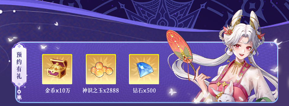游戏公测前成功预约的天选者将会得到嫦娥献礼,其中包含金币×10w,神识之玉×2888,钻石×500。