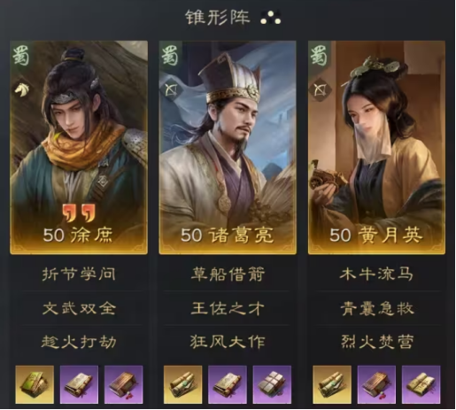 作为蜀国的核心谋略输出,诸葛亮是一名统率和智力都较高的武将,自带24%的攻心,受益于自带战法草船借箭的特性,诸葛亮和妻子黄月英的搭配是游戏中的最佳选择。至于阵容中第三位武将的选择,无论是马超、赵云还是徐庶都可以。